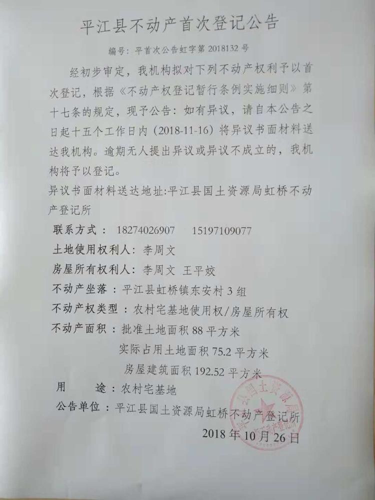 李周文 王平姣不动产首次登记公告 虹字第2018132号