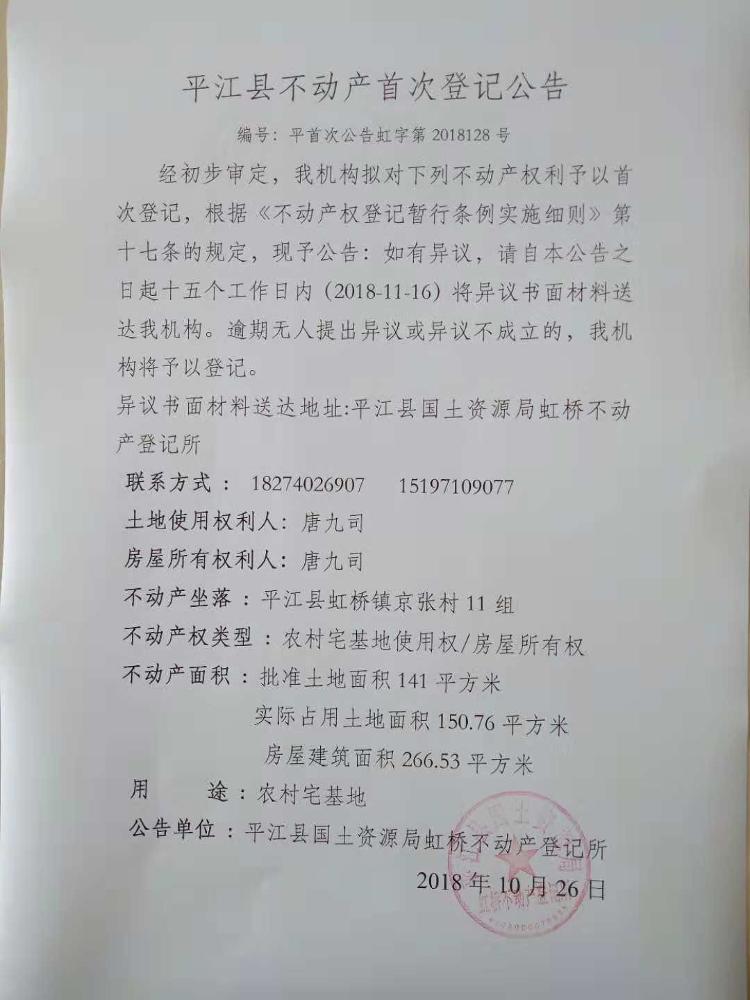 唐九司不动产首次登记公告 虹字第2018128号