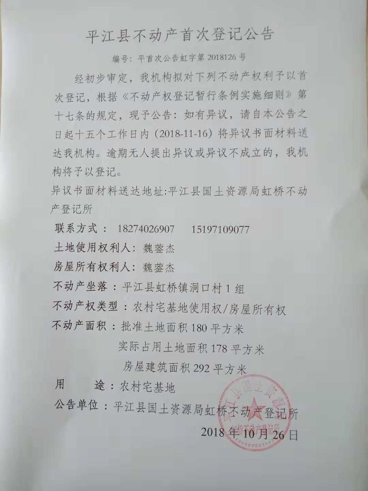 魏蓥杰不动产首次登记公告 虹字第2018126号