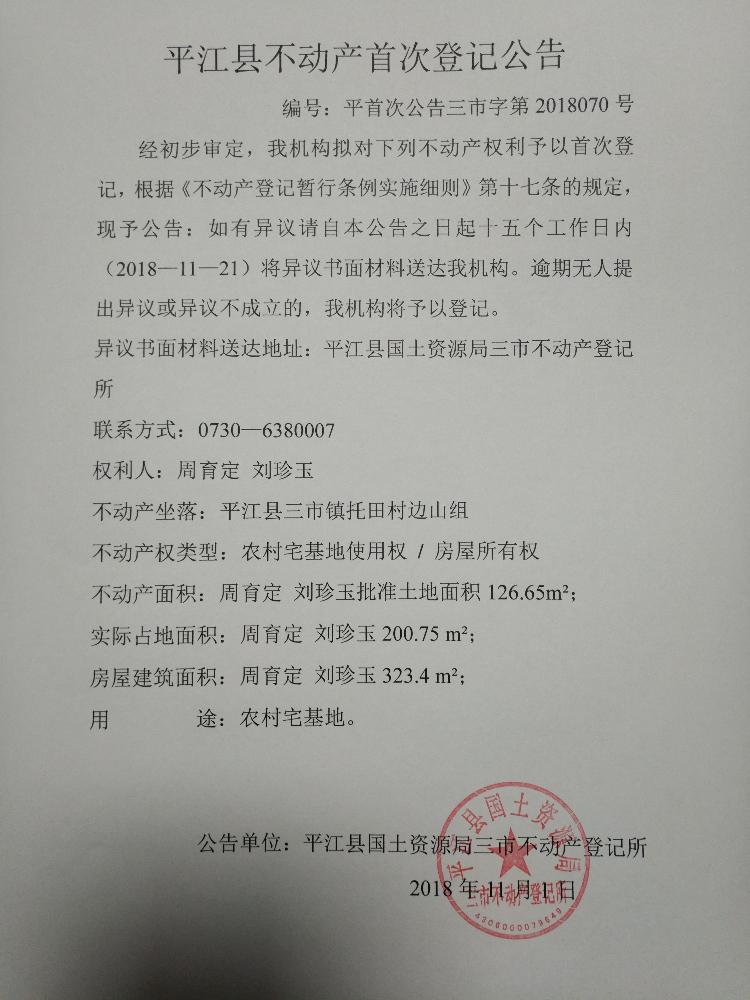 周育定 刘珍玉不动产首次登记公告 三市字第2018070号