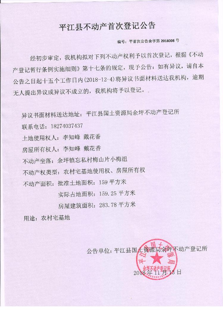 李知峰 戴花香不动产首次登记公告 余字第2018008号