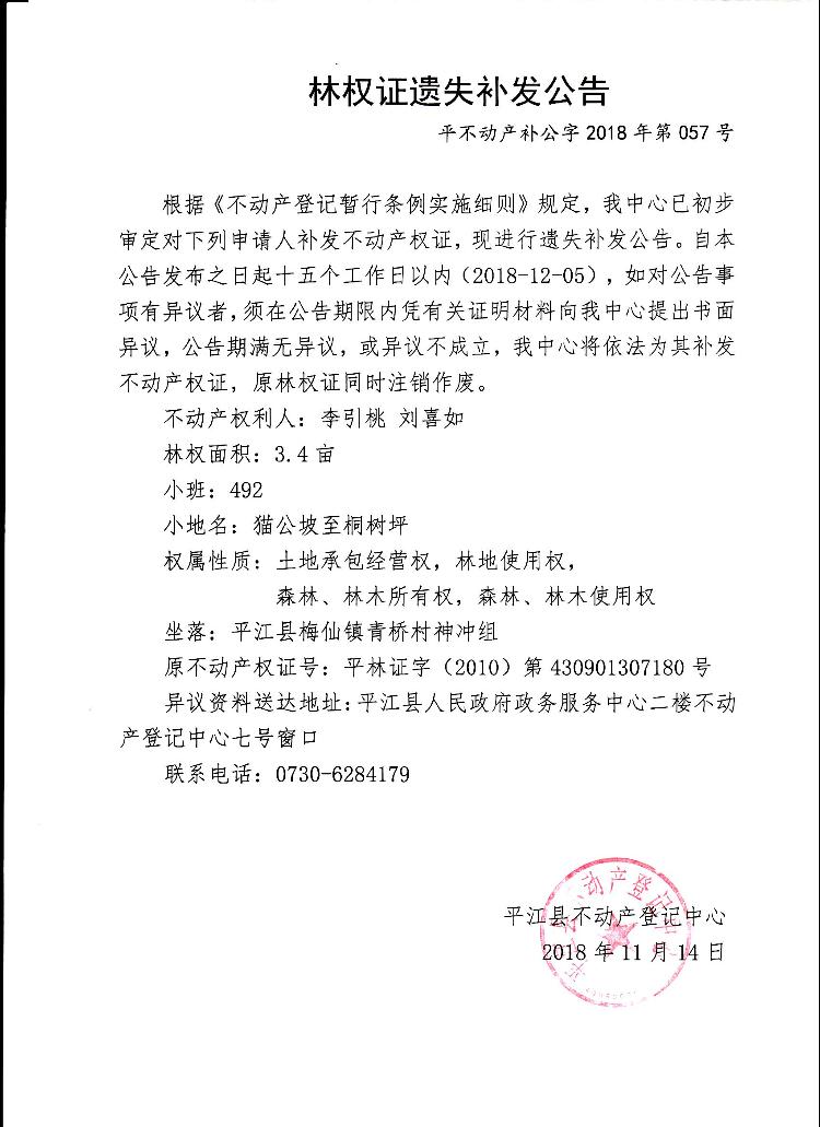 李引桃 刘喜如林权证遗失补发公告平不动产补公字2018年第057号