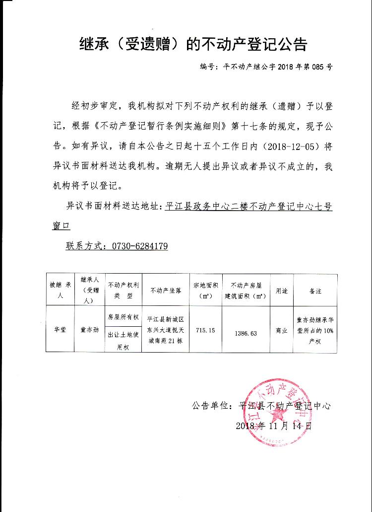 童亦劲继承(受遗赠)的不动产登记公告平不动产继公字2018年第085号
