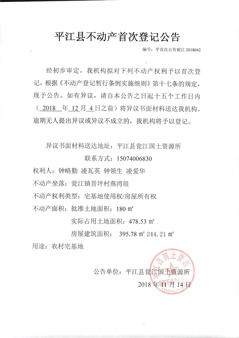 钟略勤 凌瓦英 钟领生 凌爱华 两户联建 平不动产首次登记公告 瓮江2018042