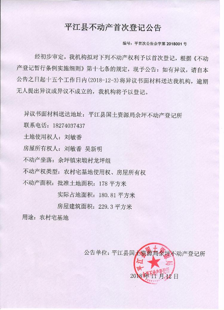 刘敏香 吴新明不动产首次登记公告 余字第2018001号