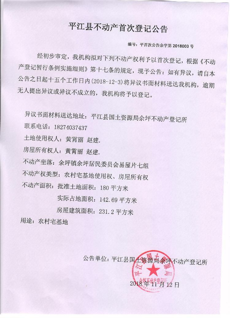黄霄丽 赵建不动产首次登记公告 余字第2018003号