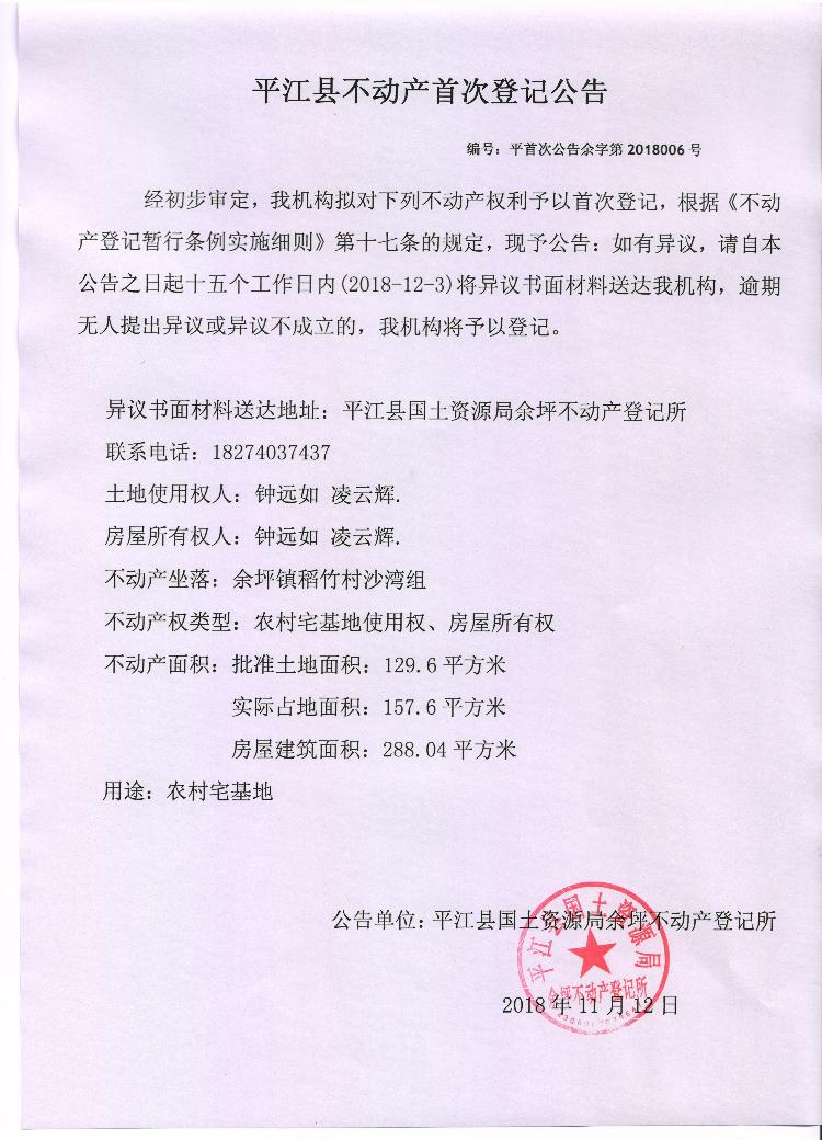 钟远如 凌云辉不动产首次登记公告 余字第2018006号