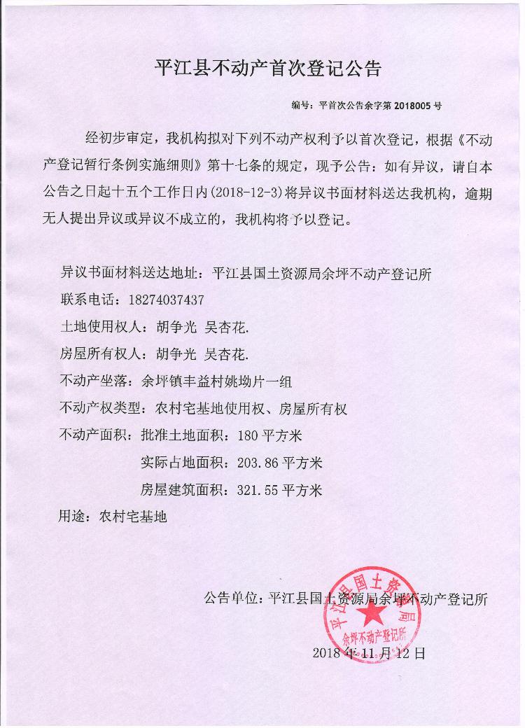 胡争光 吴杏花不动产首次登记公告 余字第2018005号