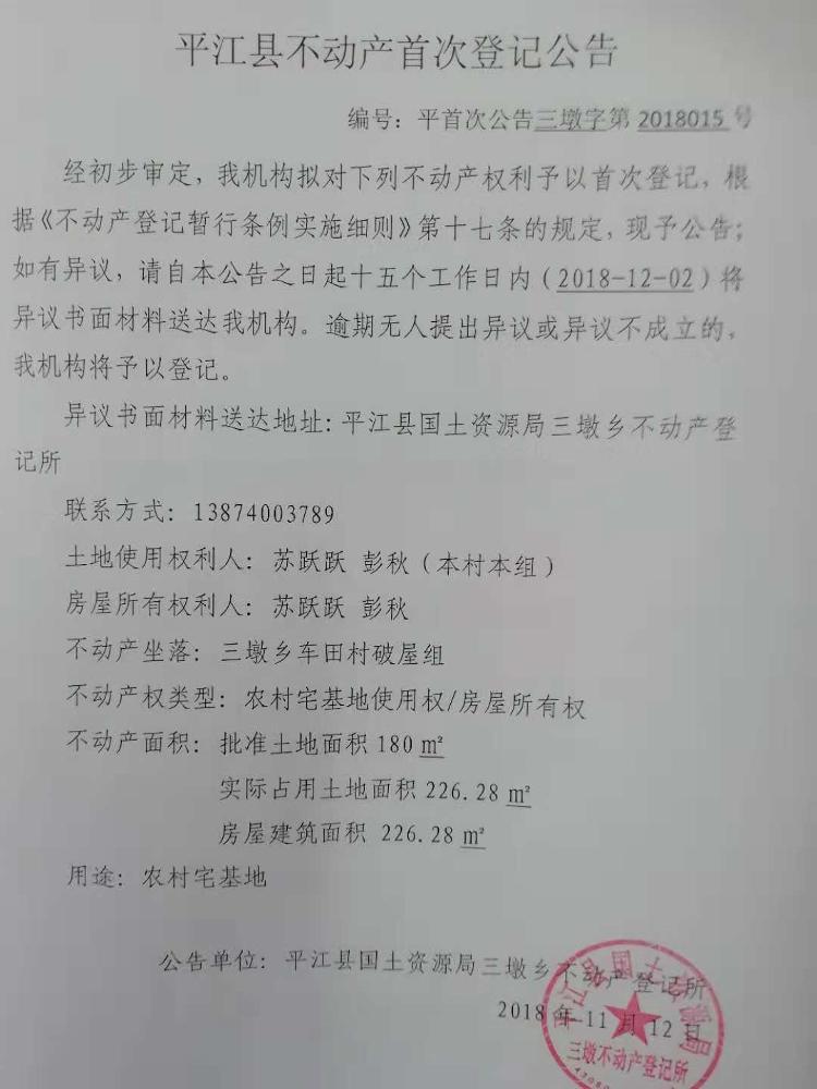 苏跃跃 彭秋不动产首次登记公告 三墩字第2018015号