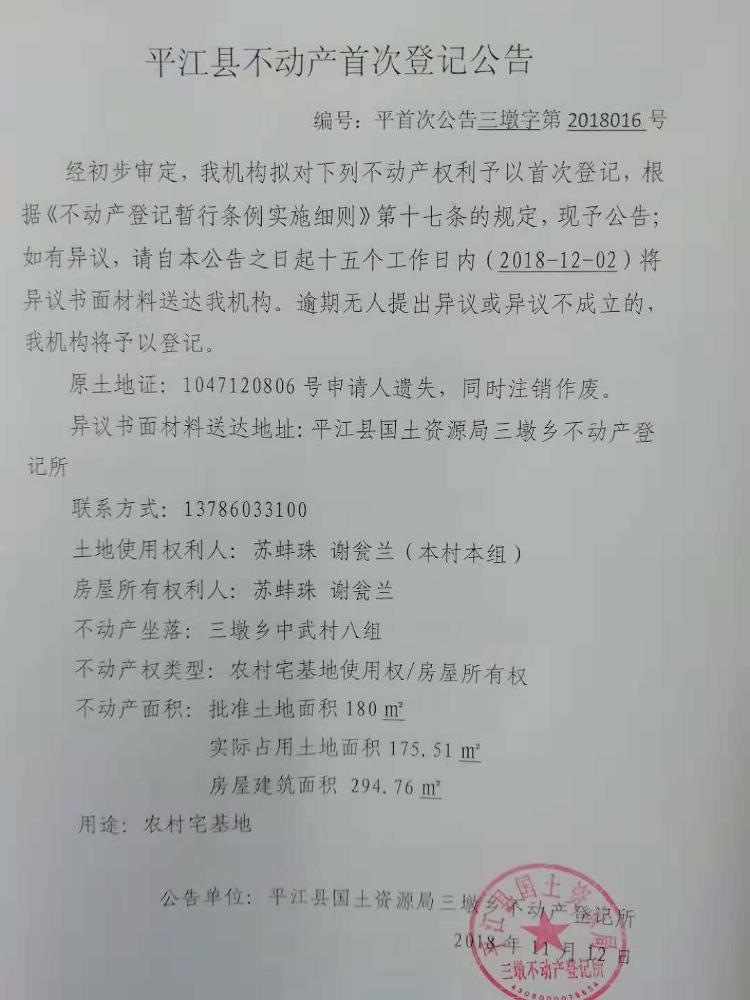 苏蚌珠 谢瓮兰不动产首次登记公告 三墩字第2018016号