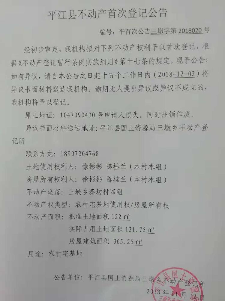 徐彬彬 陈桂兰不动产首次登记公告 三墩字第2018020号