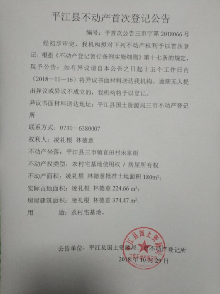 凌礼根 林德意不动产首次登记公告 三市字第2018066号