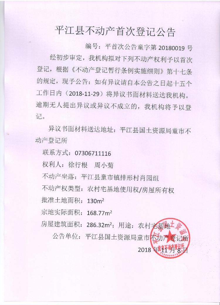 徐行根 周小菊不动产首次登记公告 童字第20180019号