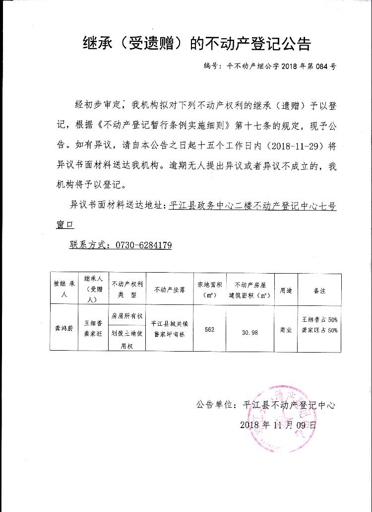 王细香、龚家旺继承(受遗赠)的不动产登记公告平不动产继公字2018年084号