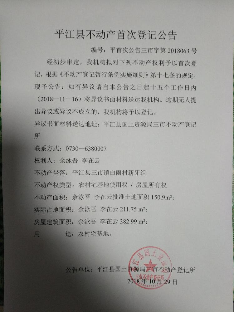 余泳吾 李在云不动产首次登记公告 三市字第2018063号