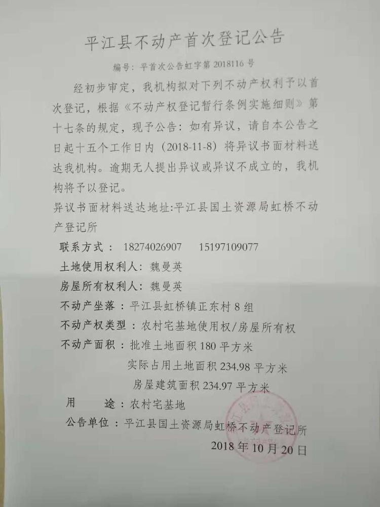 魏曼英不动产首次登记公告 虹字第2018116号