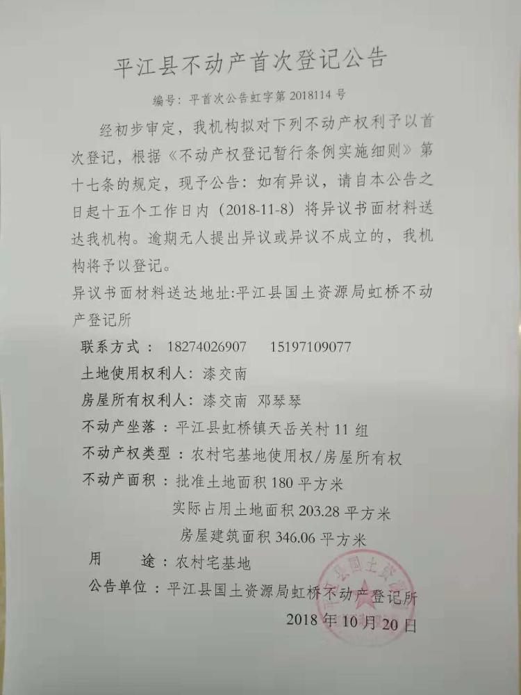 漆交南 邓琴琴不动产首次登记公告 虹字第2018114号