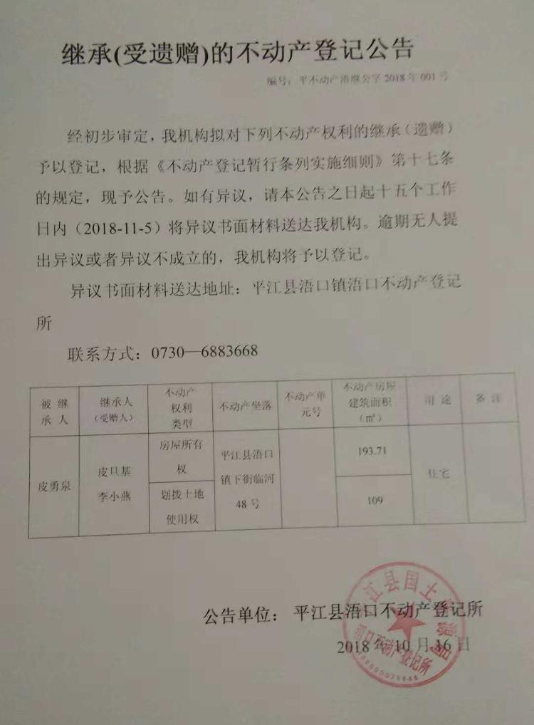 皮旦基 李小燕继承(受遗赠)的不动产登记公告 浯继公字2018年第001号