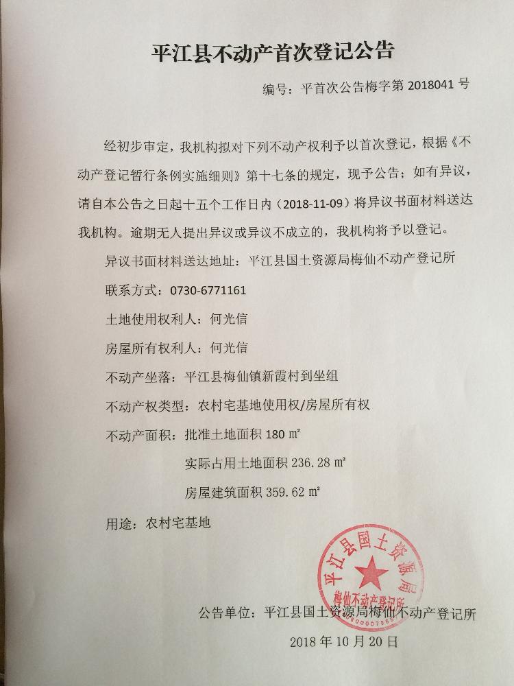 何光信不动产首次登记公告 梅字第2018041号