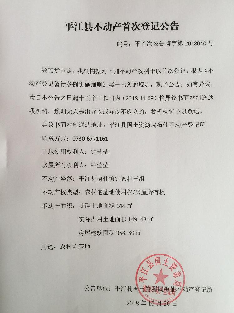 钟莹莹不动产首次登记公告 梅字第2018040号