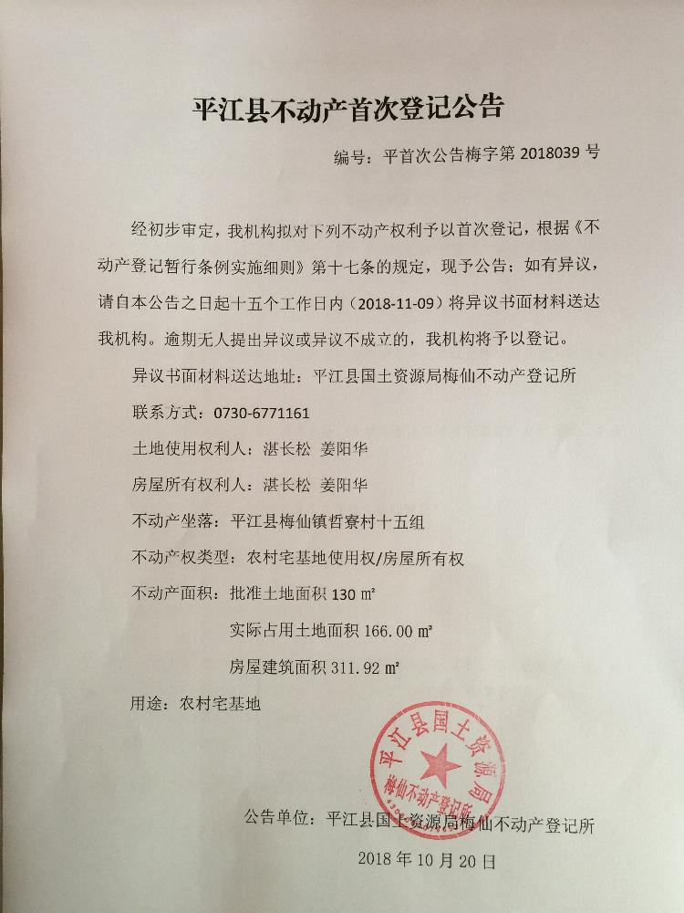 湛长松 姜阳华不动产首次登记公告 梅字第2018039号