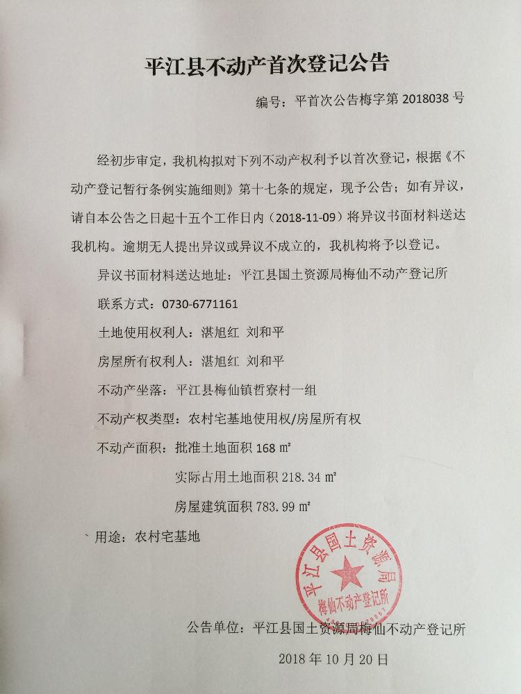 湛旭红 刘和平不动产首次登记公告 梅字第2018038号