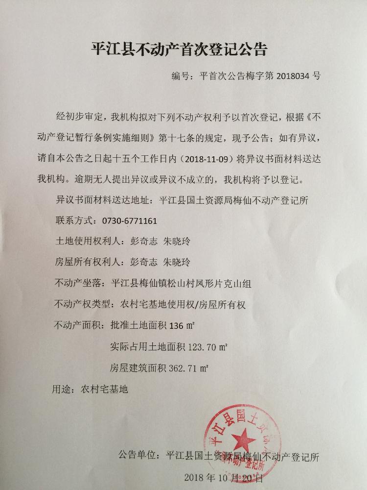 彭奇志 朱晓玲不动产首次登记公告 梅字第2018034号