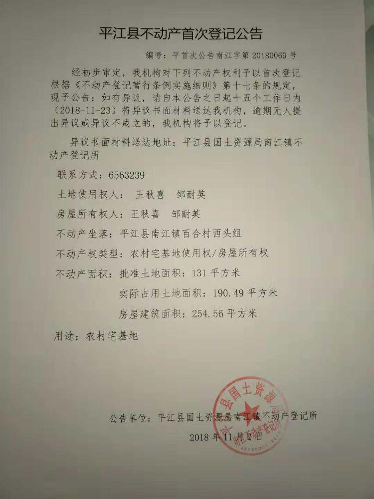 王秋喜 邹耐英不动产首次登记公告 南江字第20180069号