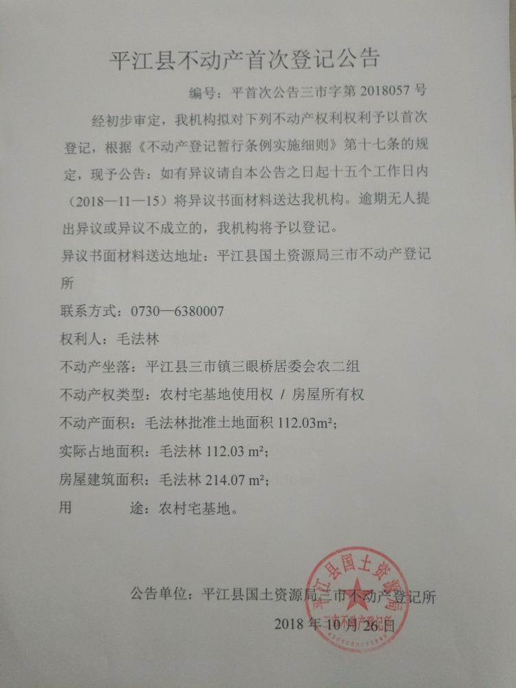 毛法林不动产首次登记公告 三市字第2018057号