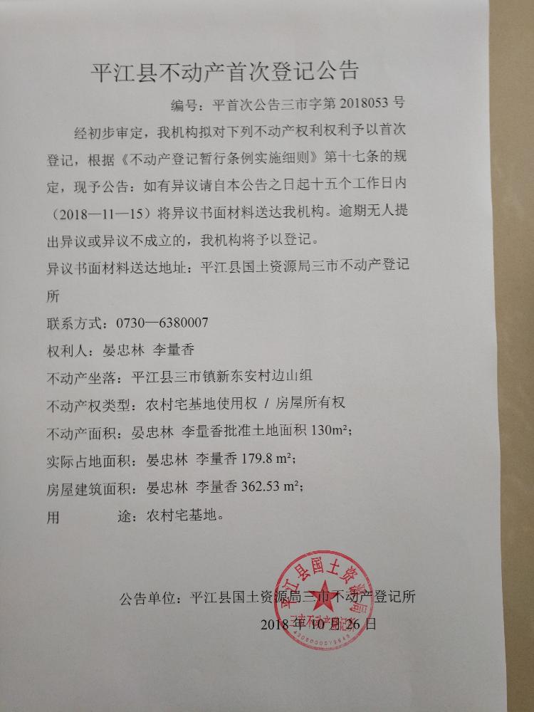 晏忠林 李量香不动产首次登记公告 三市字第2018053号