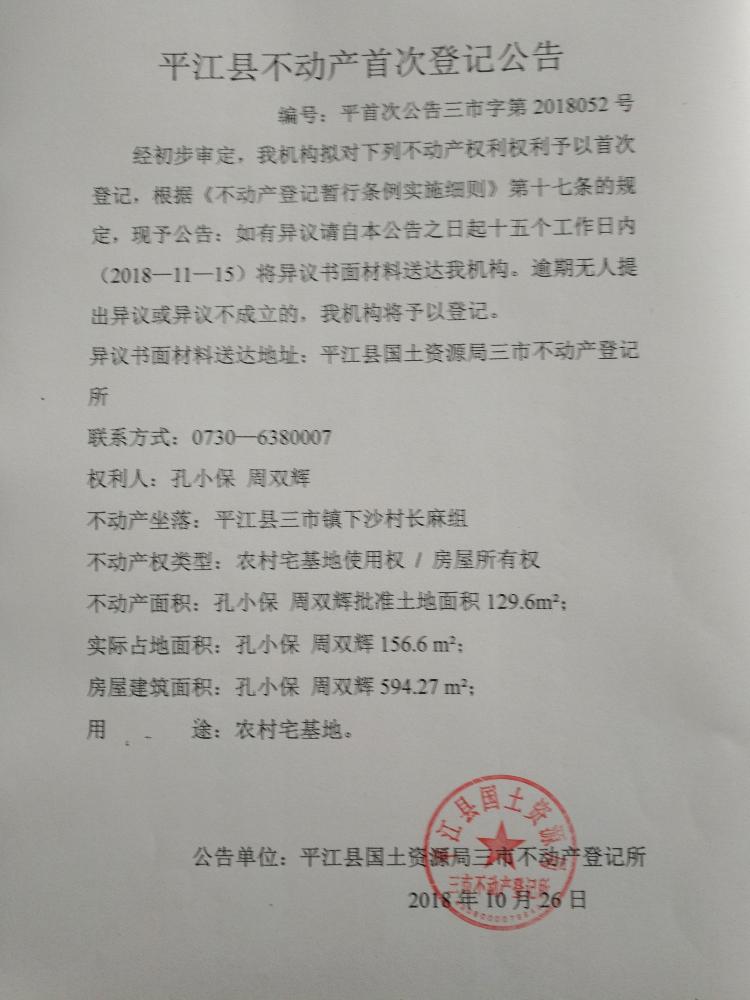 孔小保 周双辉不动产首次登记公告 三市字第2018052号
