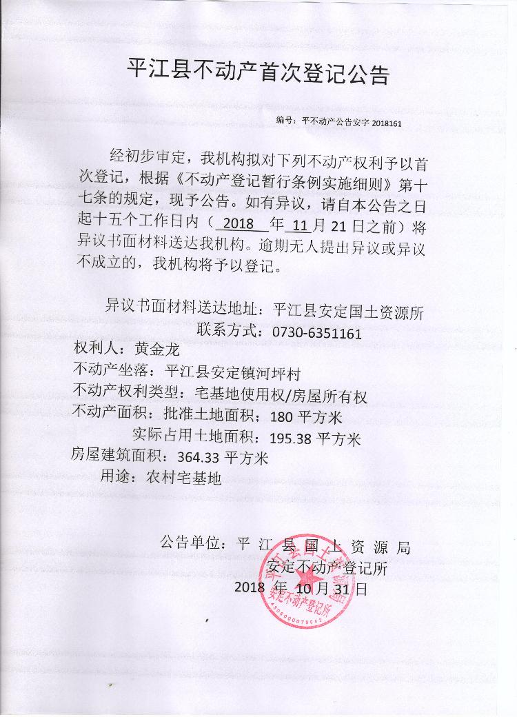 黄金龙不动产首次登记公告 安字2018161