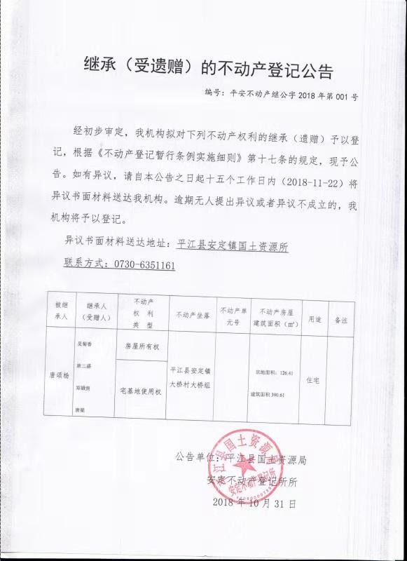 吴菊香 唐三盛 郑娥贵 唐梁继承(受遗赠)的不动产登记公告 安继公字2018年第001号