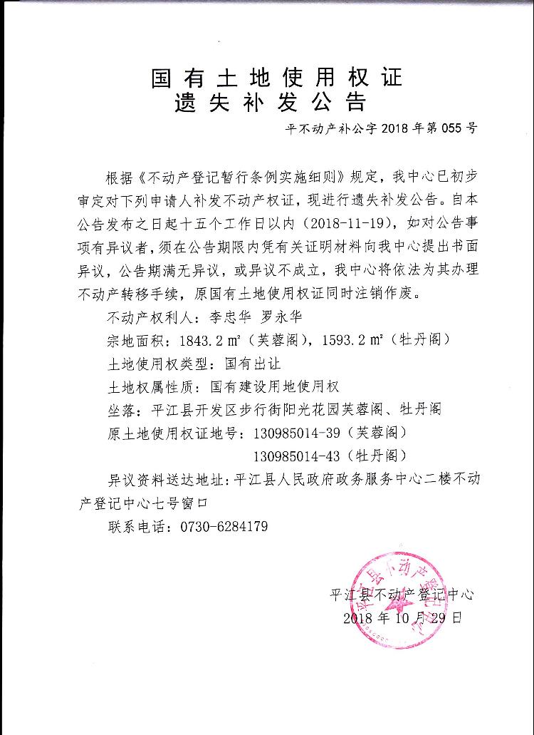 李忠华 罗永华国有土地使用权证遗失补发公告 平不动产补公字2018年第055号