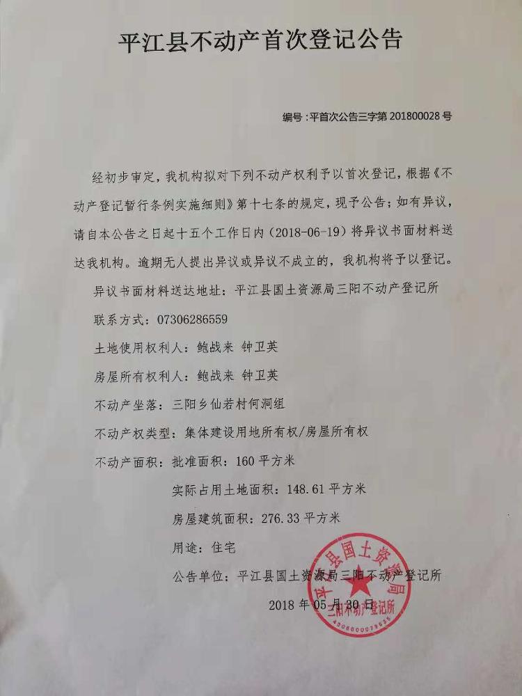 三阳乡 鲍战来 钟卫英 不动产登记公告