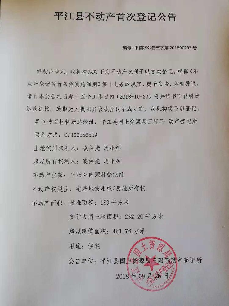 三阳乡 凌保光 周小辉 不动产登记公告
