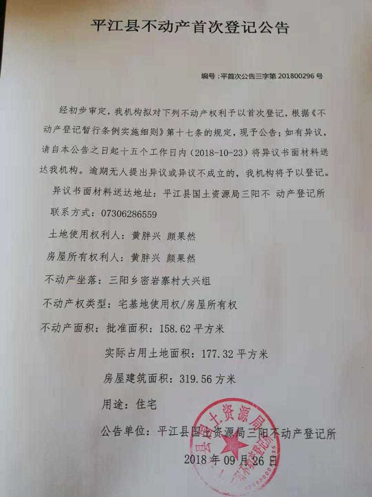 三阳乡 黄胖兴 颜果然 不动产登记公告