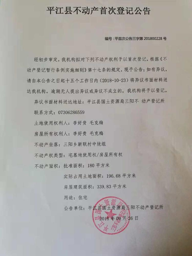 三阳乡 李好贵 毛克梅 不动产登记公告