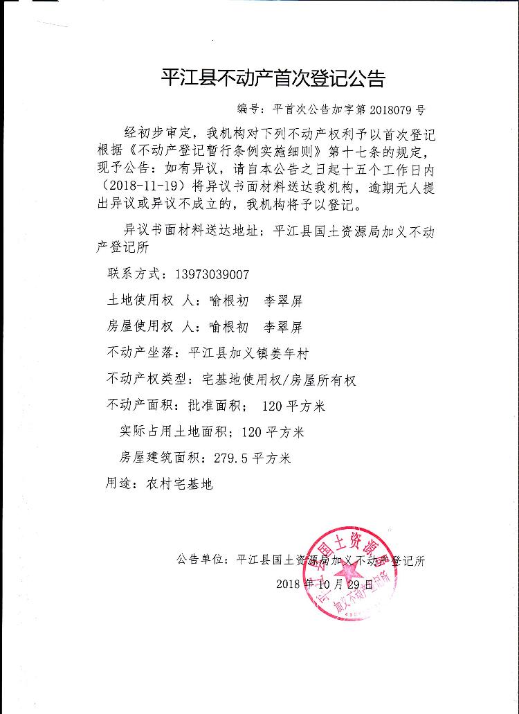 喻根初 李翠屏不动产首次登记公告 加字第2018079号
