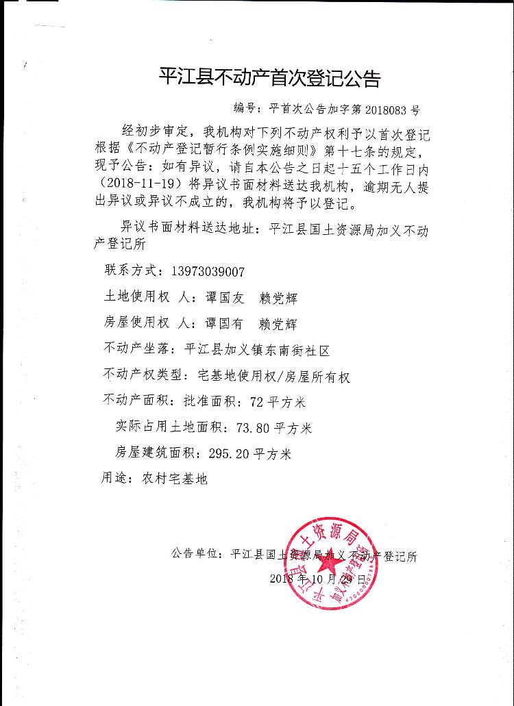 谭国友 赖党辉不动产首次登记公告 加字第2018083号