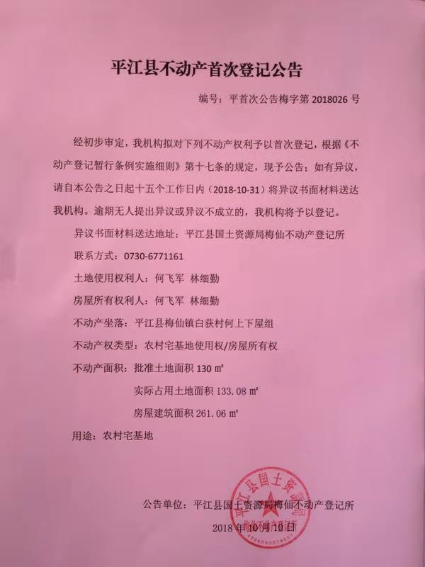 何飞军 林细勤不动产首次登记公告 梅字第2018026号