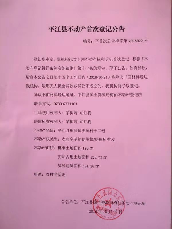 黎衡峰 胡红梅不动产首次登记公告 梅字第2018022号
