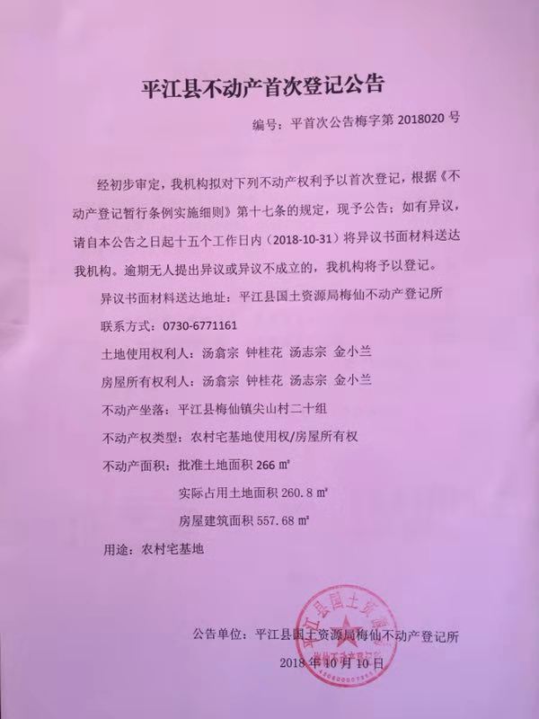 汤翕宗 钟桂花 汤志宗 金小兰不动产首次登记公告(两户联建) 梅字第2018020号