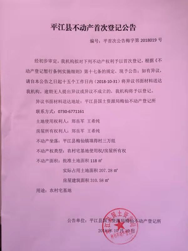 郑岳军 王希纯不动产首次登记公告 梅字第2018019号