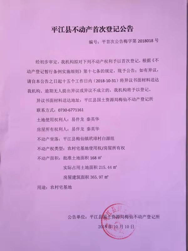 易伴龙 秦英华不动产首次登记公告 梅字第2018018号