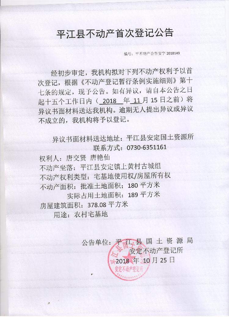 唐交贤 唐艳仙不动产首次登记公告 安字2018149