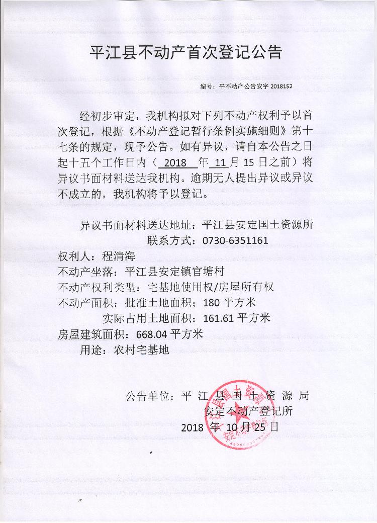 程清海不动产首次登记公告 安字2018152