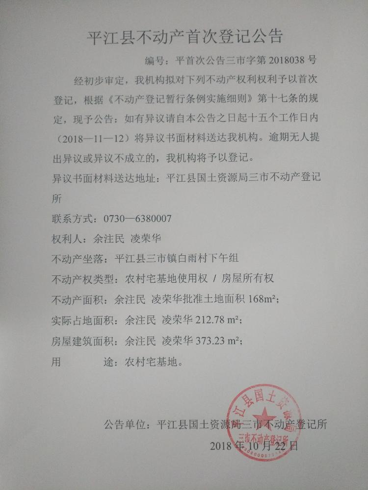 余注民 凌荣华不动产首次登记公告 三市字第2018038号