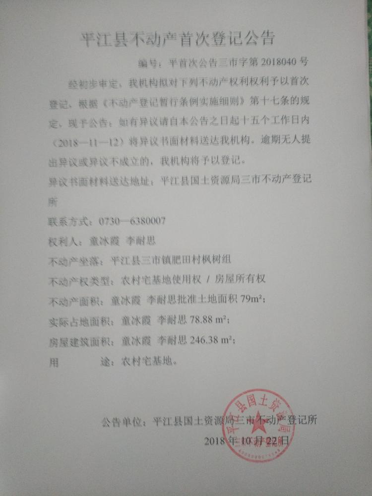 童冰霞 李耐思不动产首次登记公告 三市字第2018040号