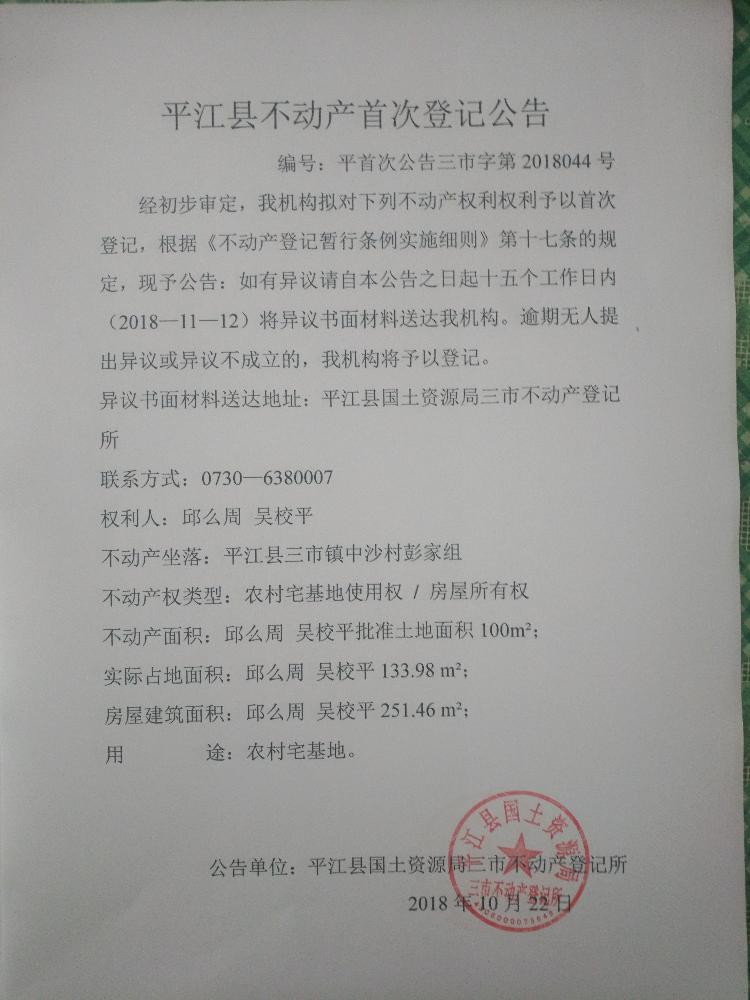 邱么周 吴校平不动产首次登记公告 三市字第2018044号
